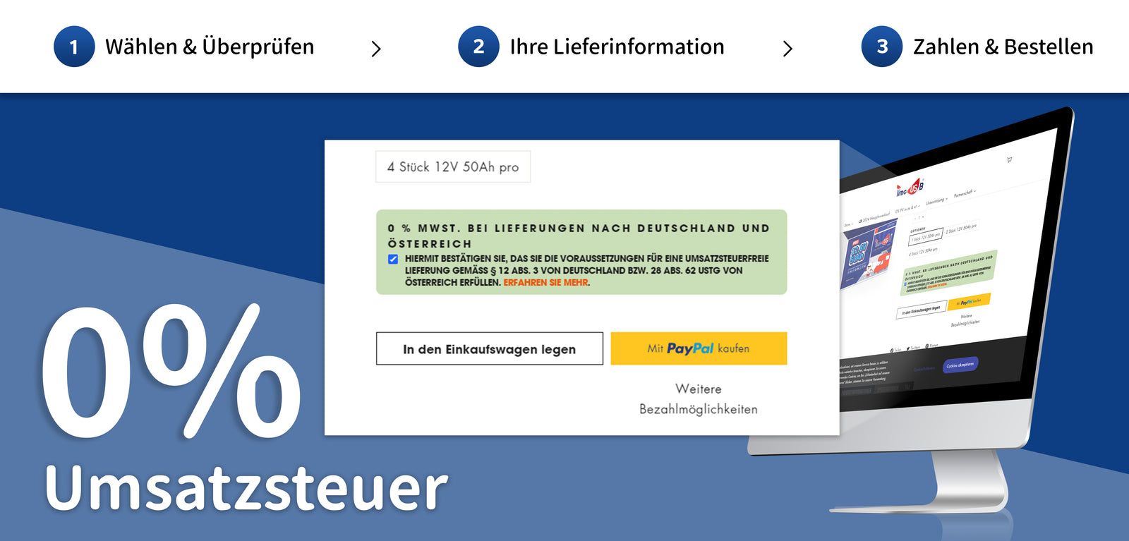 Timeusb Produkte sind generell für die autarke Stromerzeugung im Camper oder Wohnmobil gedacht. Sie können aber genauso gut bei sich zuahause am Balkon, auf dem Dach oder auf der Terasse nutzen.Bei uns Timeusb Shop haben Sie ab sofort die Möglichkeit, bestimmte Artikel mit Nullsatz Mehrwertsteuer online zu bestellen. Die betroffenen Produkte sind mit einem Title „Tax-free” gekennzeichnet. Um von der gesenkten Steuer zu profitieren, müssen Sie die Bedingungen laut § 12 ABS. 3 USTG (für Deutschland) oder § 28 Abs. 62 UStG 1994 (für Österreich) erfüllen.Oder Sie befinden sich in der Ukraine. Details dazu finden Sie weiter unten.Packen Sie Ihre Artikel wie gewohnt in den Warenkorb, an der Kasse bestätigen Sie dann die Erfüllung der Bedingungen mittels eines Häkchen im letzten Bestellschritt. Dann wird der Steuersatz der betreffenden Produkte automatisch angepasst.